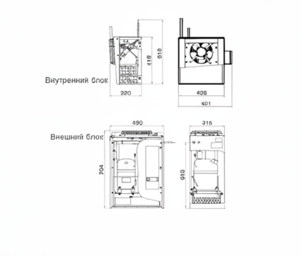 490(690)х315х704мм Габаритные размеры внешнего блока, 408(481)х280х418(618)мм Габаритные размеры внутреннего блока, Хладагент R404a Температурный режим, °С -5...+10, Maксимальное энергопотребление, кВт 0.6, 220В, Производительность 600м3/час