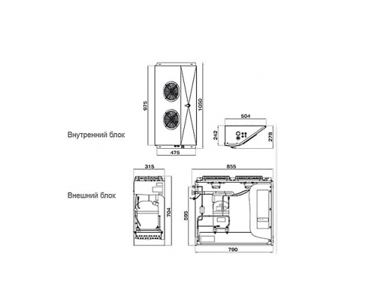 855х315х704мм Габаритные размеры внешнего блока, 1050х504х278мм Габаритные размеры внутреннего блока, Хладагент R404a Температурный режим, °С -5…+10, Maксимальное энергопотребление, кВт 1,15, 220В, Производительность 1200м3/час