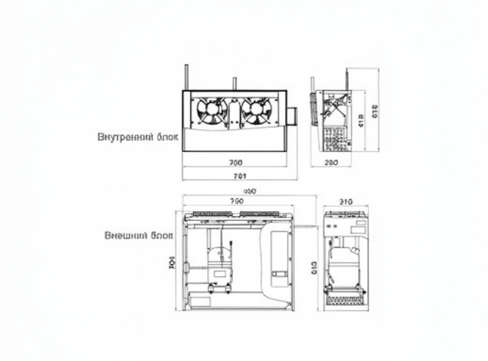 790(990)х315х704мм Габаритные размеры внешнего блока, 708(781)х280х418(618)мм Габаритные размеры внутреннего блока, Хладагент R404a Температурный режим, °С -5...+10, Maксимальное энергопотребление, кВт 1,65, Производительность 1200м3/час