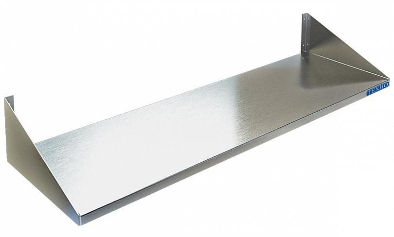 1400х400х145мм, Полка сплошная из нержавеющей стали марки AISI 430 толщиной 0,8мм, разборная, болтовое соединение. Навесные полки крепятся к стене при помощи двух боковых кронштейнов. Кронштейн крепления может быть, как сверху, так и снизу полки. Полки рекомендуется крепить к влагоустойчивым поверхностям. Возможно размещение полок одна над другой. Полка поставляется в разобранном виде.