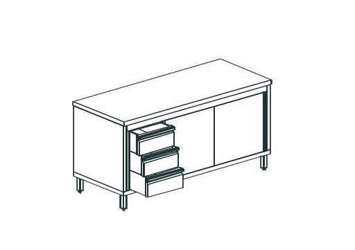 Материал изготовления: нержавеющая сталь AISI 304, двери-купе, ящики слева, количество ящиков: 3, регулируемые ножки, полка сплошная, закрытое исполнение.