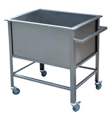 700х600х700мм, Одна сварная емкость размером 600х500х300 из нержавеющей стали марки AISI 304 толщиной 0,8мм., каркас сварной из трубы 40х20 покрытой порошковой краской серого цвета, толщиной 1,2мм, сливной штуцер из трубы Д33, кран ДУ25 - 1 дюйм. 4 колеса D 125 мм, 2 с тормозом. Ванна поставляется в собранном виде.