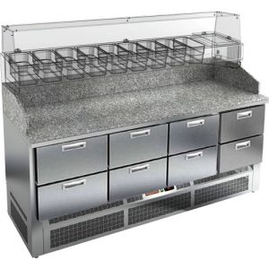 1970х700х1050мм, PZE3-2222/GN КАМЕНЬ стол для пиццы охл. (+2+10), 8 ящиков, с бортом с 3х сторон, 1970х700х1050мм