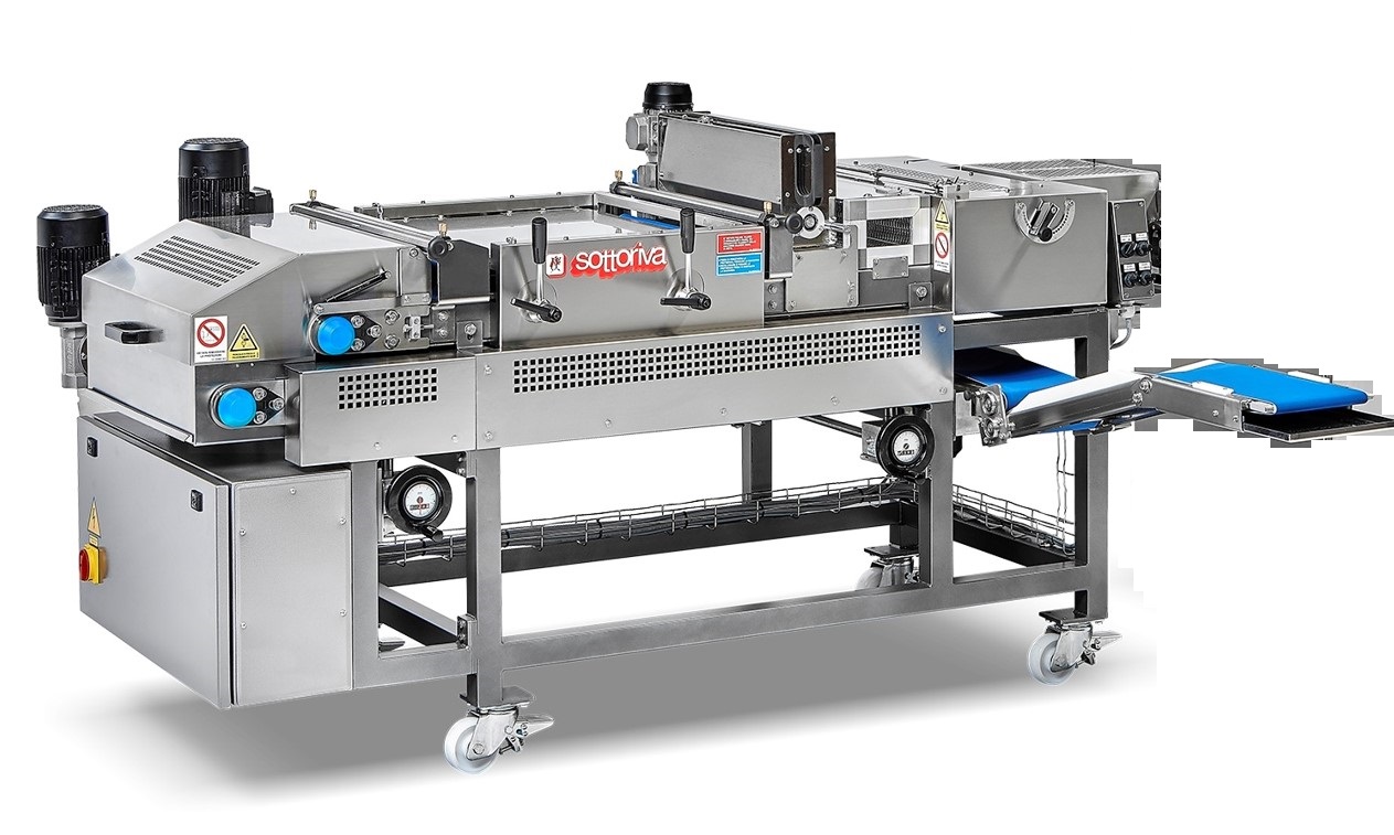 2100х950х1400 мм, 400 кг, 1,1 кВт, раскатка осущетвляется 2 роликами, ширина блока для закатки 600мм. это моторизированный конвейерный блок, который настраивается по высоте. Для багетов, батонов, булочек для хот-догови других видов продолговатого хлеба. Можно инвертировать направления движения закатки, таким образом получать приплюснутые изделия вроде булочек для гамбургера. Мукоподсыпатель включен в комплектацию