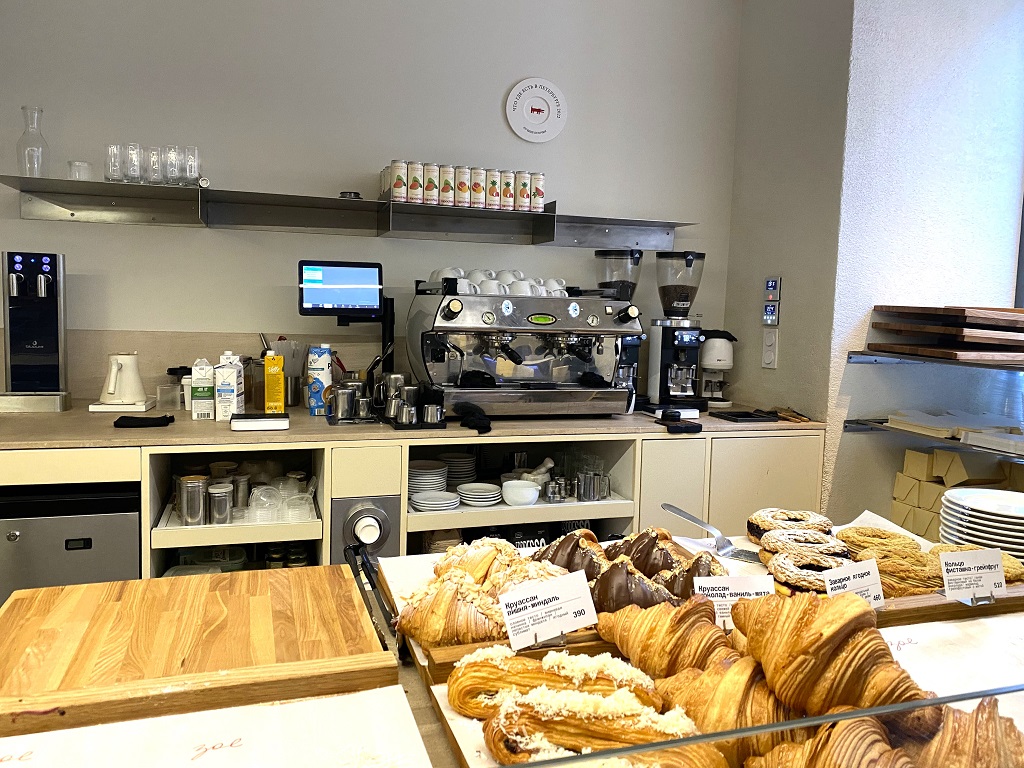 Внутри — просторный зал, деревянная мебель в скандинавском стиле, свежие цветы на столах, а также — кухня с пекарским цехом и огромная витрина с выпечкой.