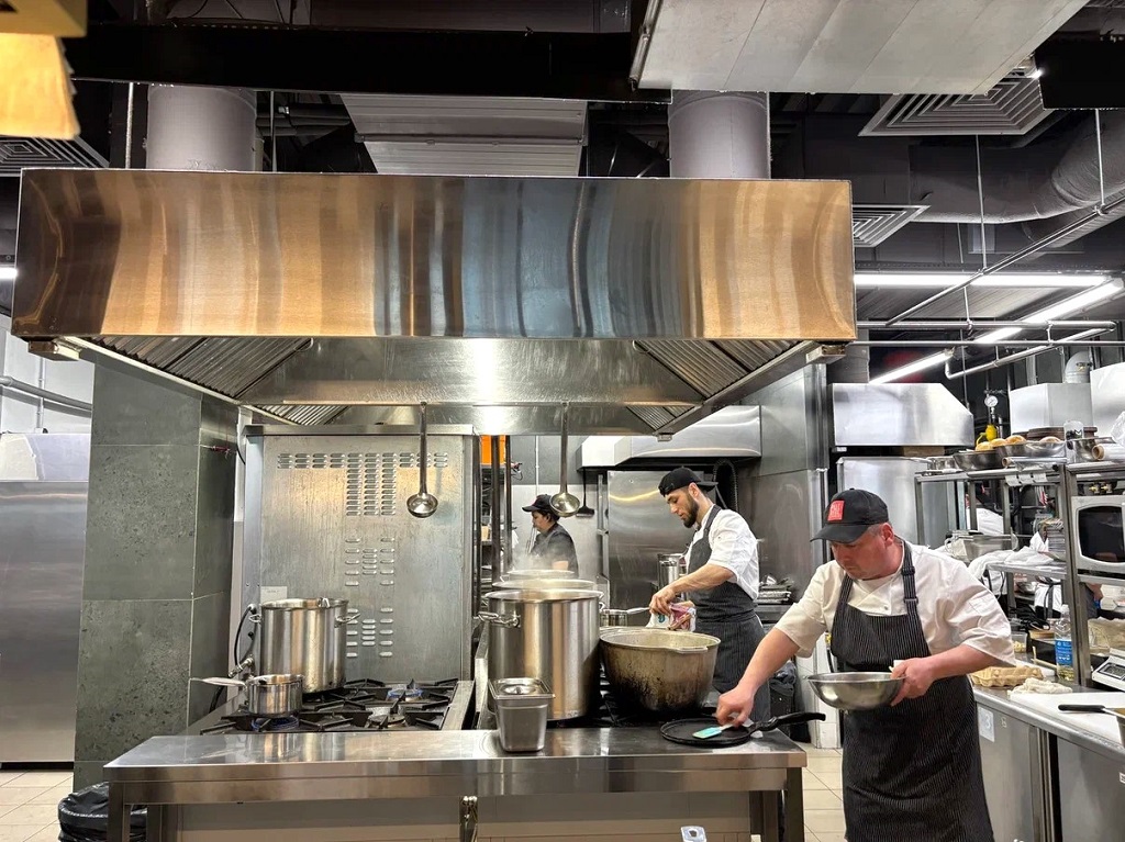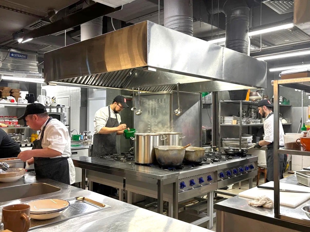За каждую зону отвечает отдельный поварской тандем во главе с су-шефом. Это сильно ускоряет работу, позволяет одновременно готовить самые разнообразные блюда и отдавать их синхронно. Например, стейк + салат + хачапури.