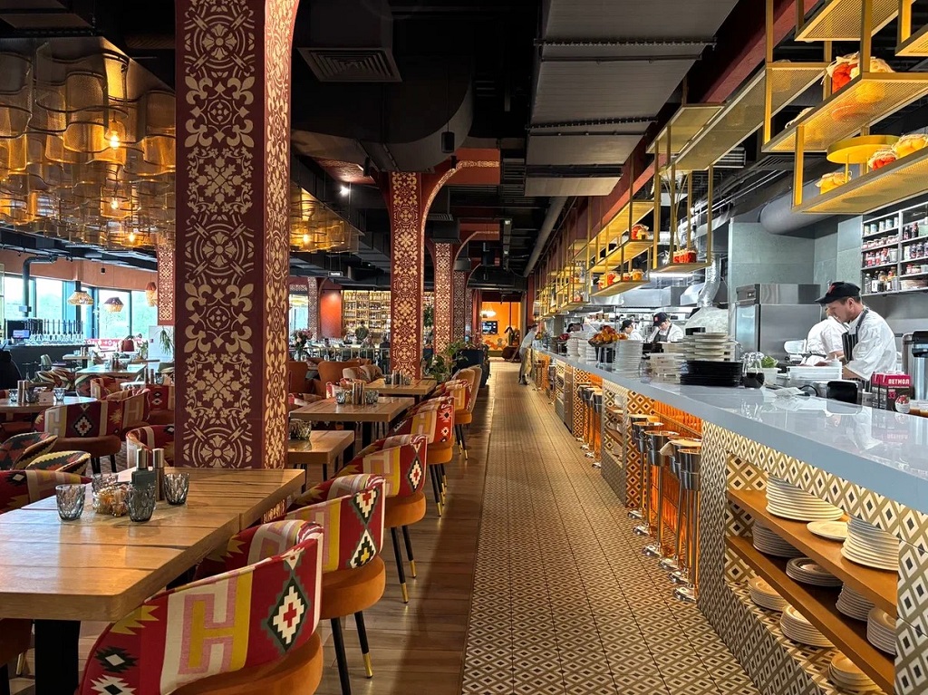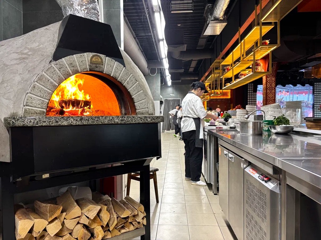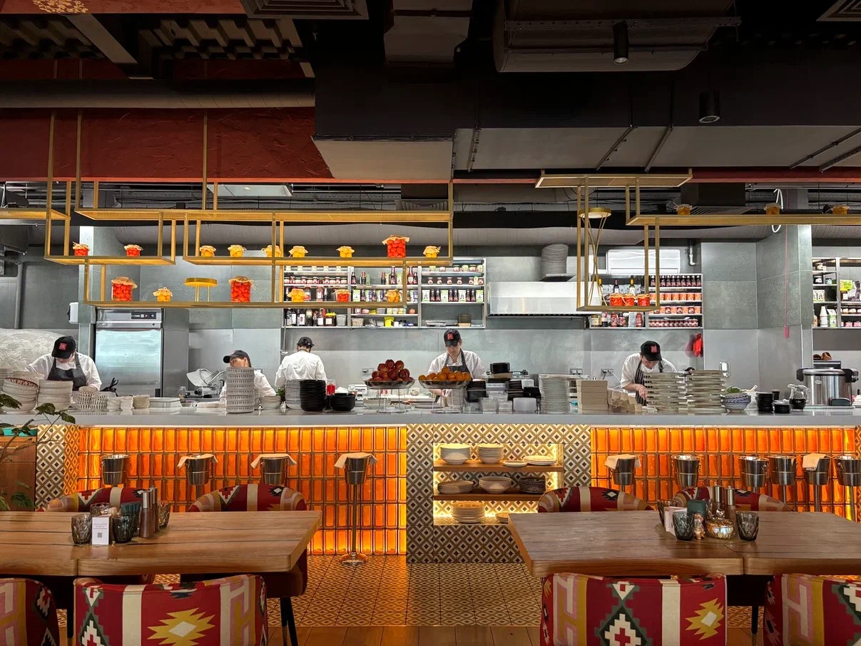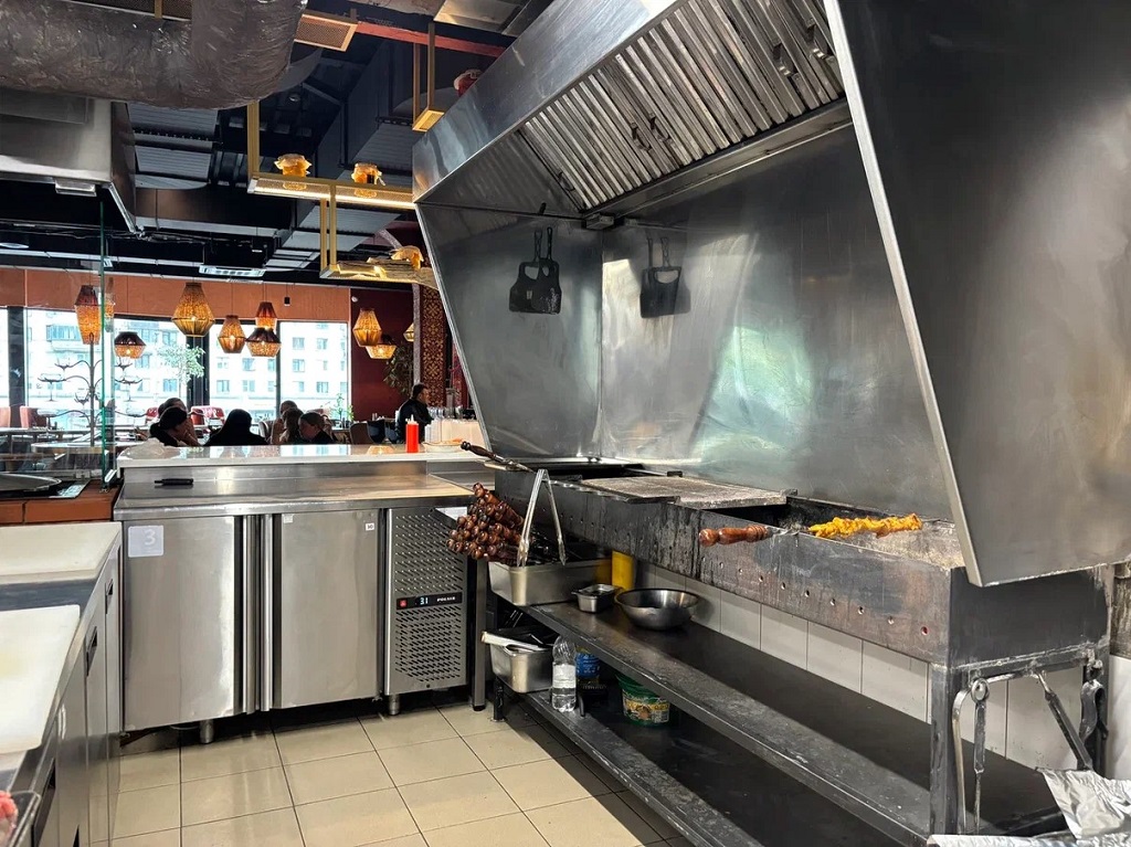 Между кухней и залом «красной линией» проходит длинная раздача. Она поделена на секции по тематическим направлениям: блюда на мангале, суши, тандыр, дровяная печь, салаты, кондитерские изделия…