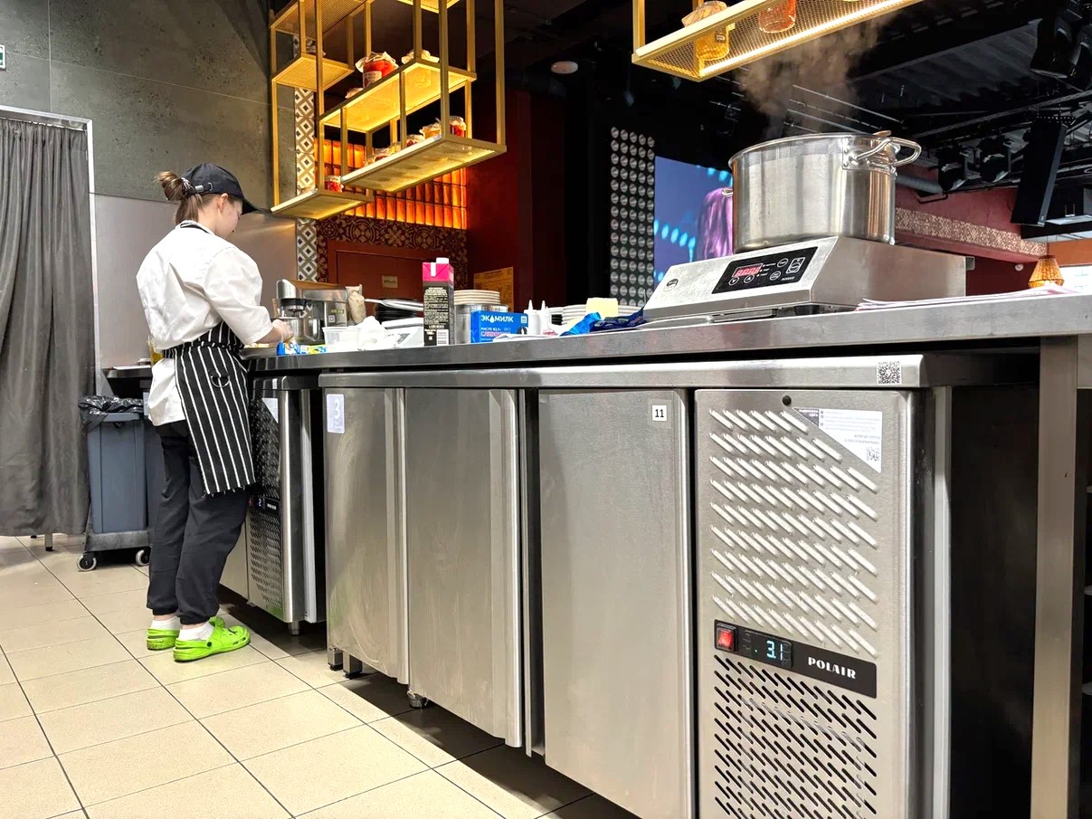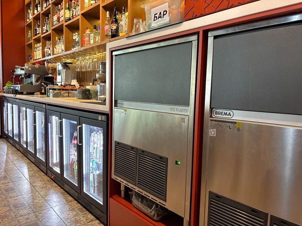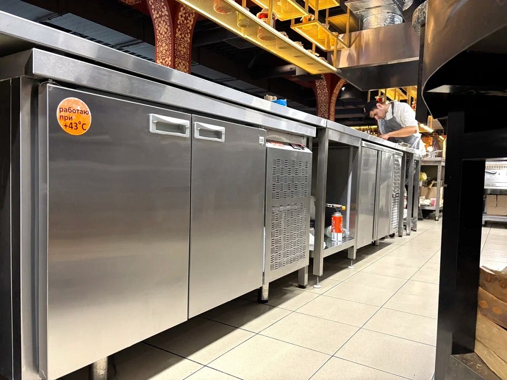 На бэке смонтированы высокие холодильные и морозильные камеры POLAIR высотой 2,70 со сплит-системами, организована зона хранения ингредиентов (мука, крупы, корнеплоды), а также установлены недорогие и надежные шкафы для вина POZIS с охлаждением.