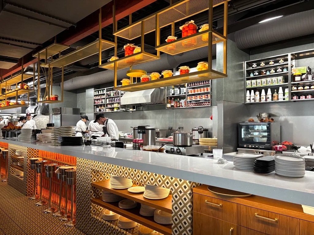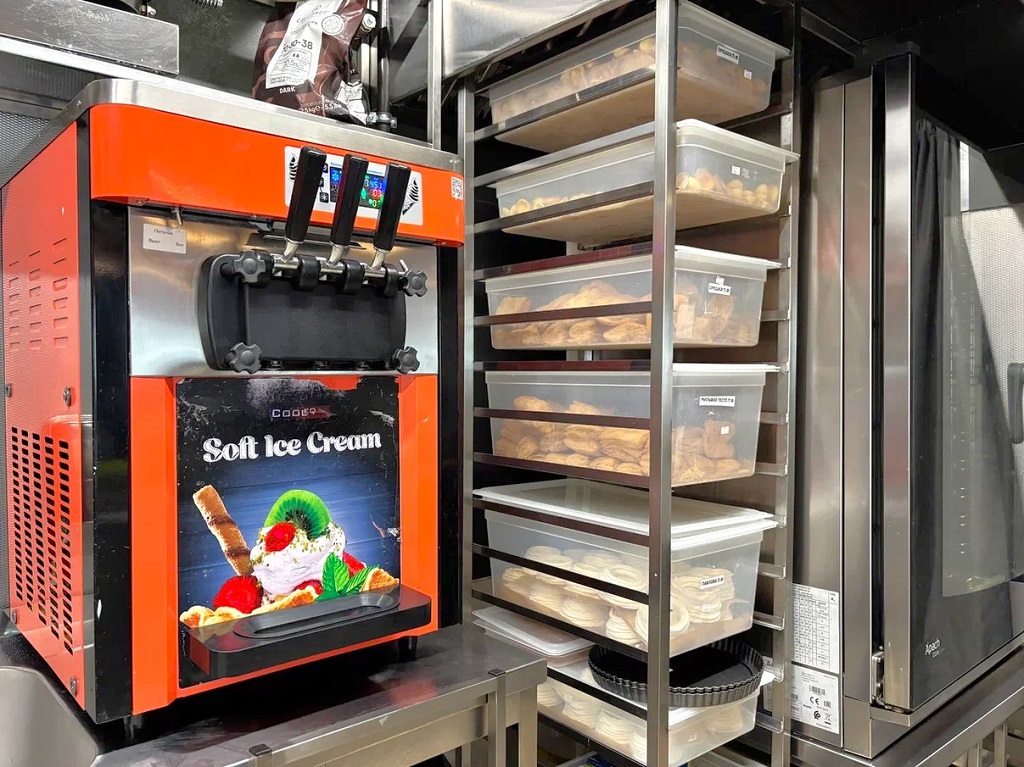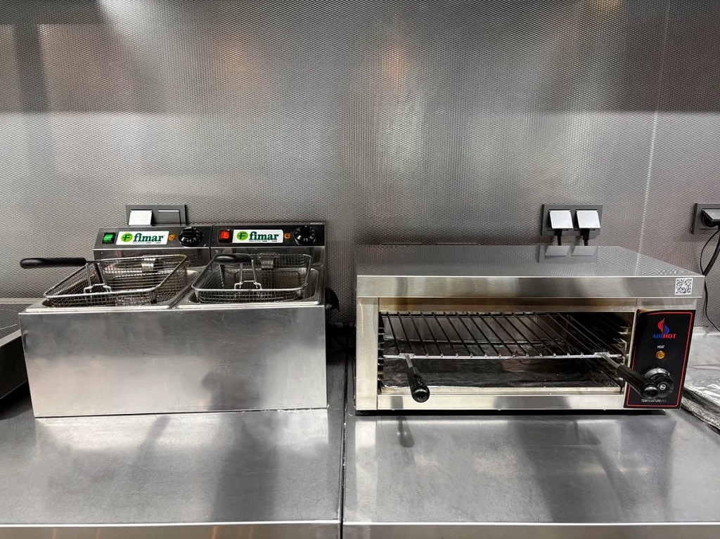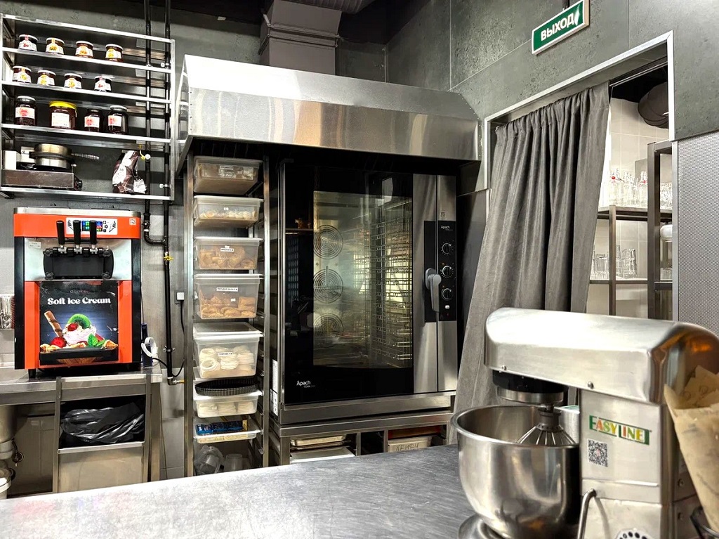 Каждая гастрономическая зона укомплектована своим набором оборудования: холодильные столы, ванны-мойки, настольные аппараты — индукционные плиты, блендеры, рисоварки, фритюрницы, печи, весы.