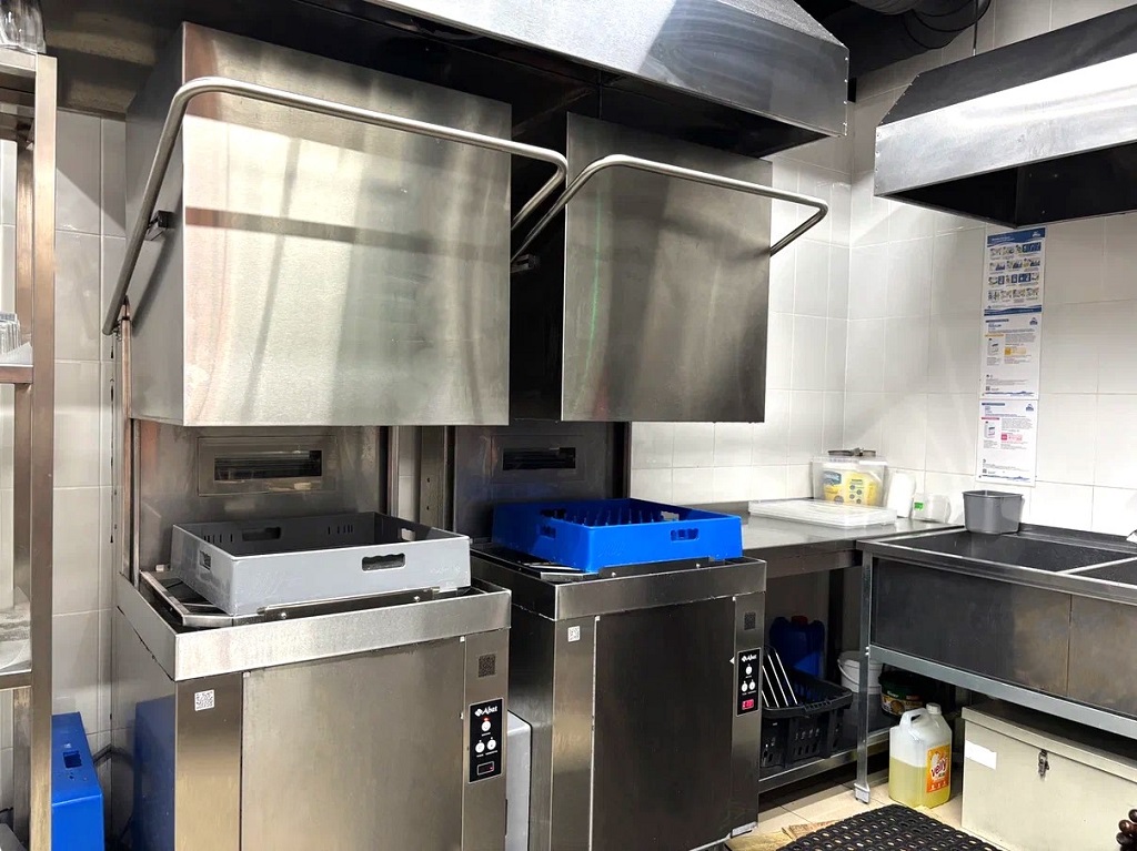 Сверху над всем тепловым и моечным оборудованием смонтированы приточно-вытяжные зонты. Они улавливают неприятные запахи, избыток тепла, пары и конденсат (например, от посудомоечных машин), поддерживая приятный микроклимат на кухне и в зале ресторана.