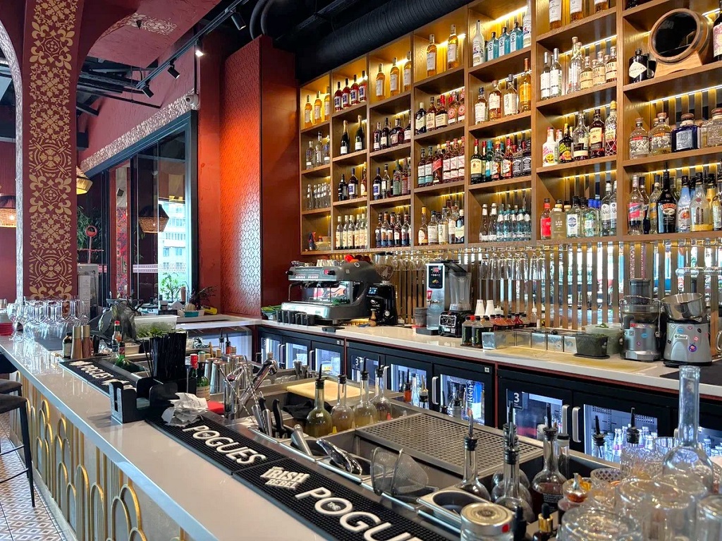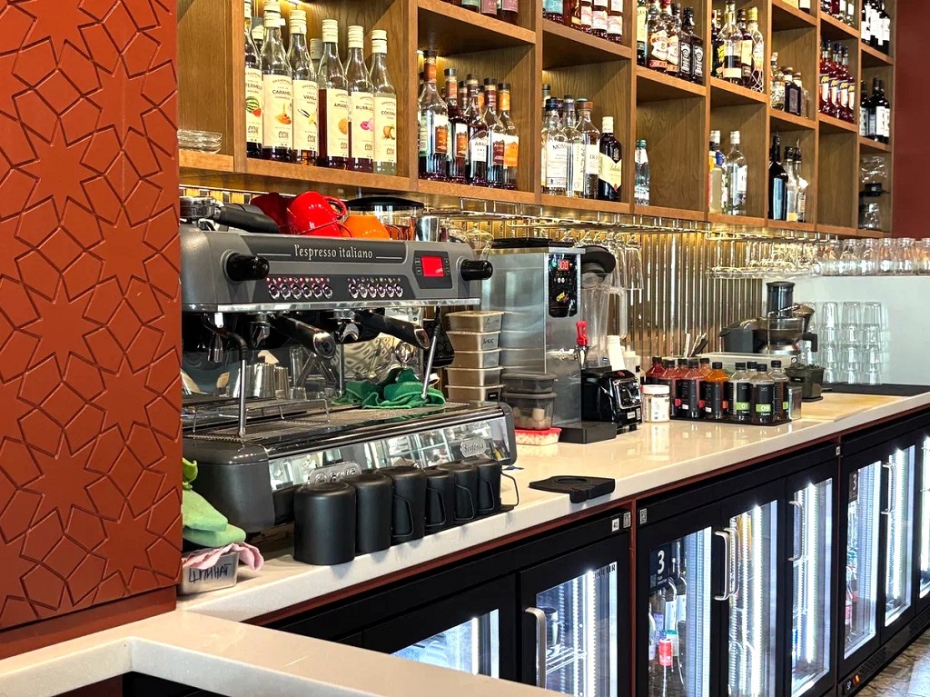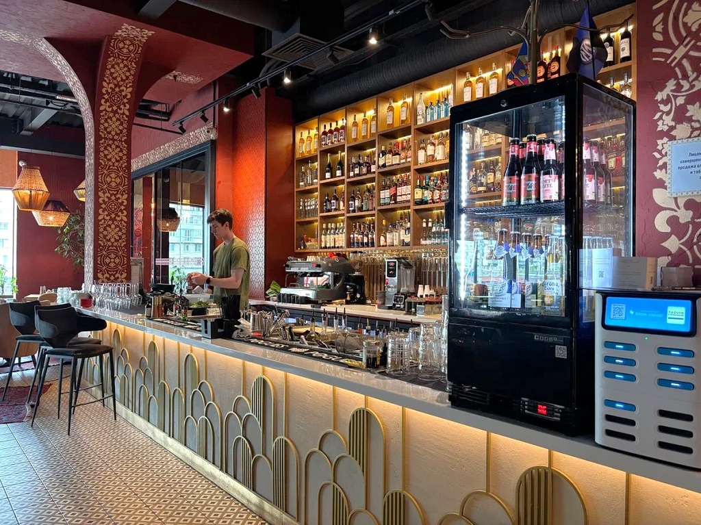 Отдельного внимания заслуживает бар. Он получился большим и комфортным, под стать всему заведению. Оснащен специальной барной станцией, столами-холодильниками, кофемашиной, кипятильником для воды. Бармен может готовить широкий спектр прохладительных и горячительных напитков — от чая и лимонада до авторских коктейлей и домашних настоек.