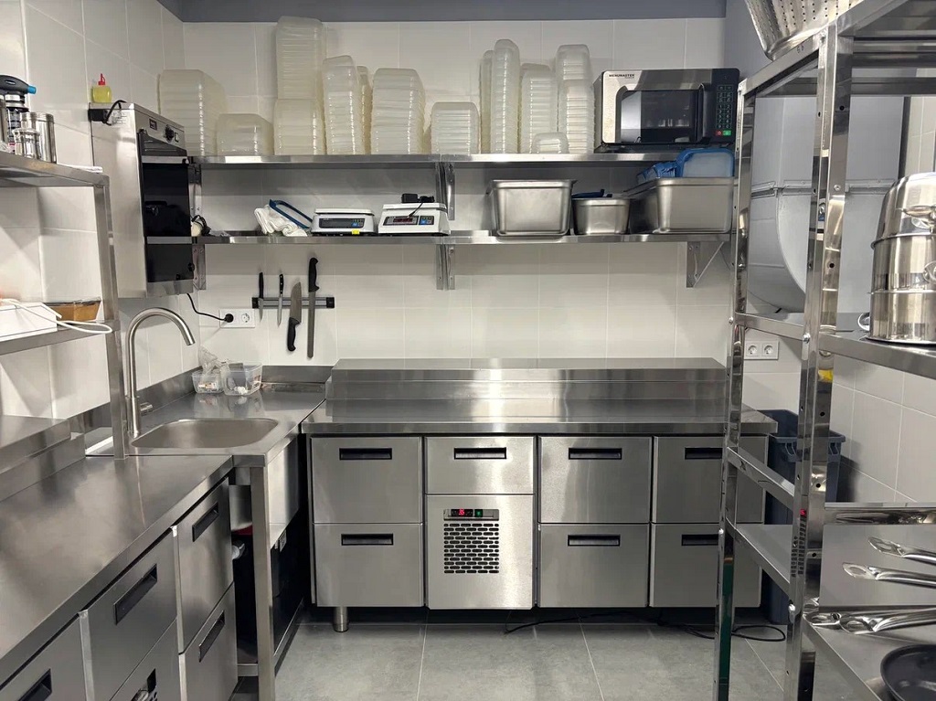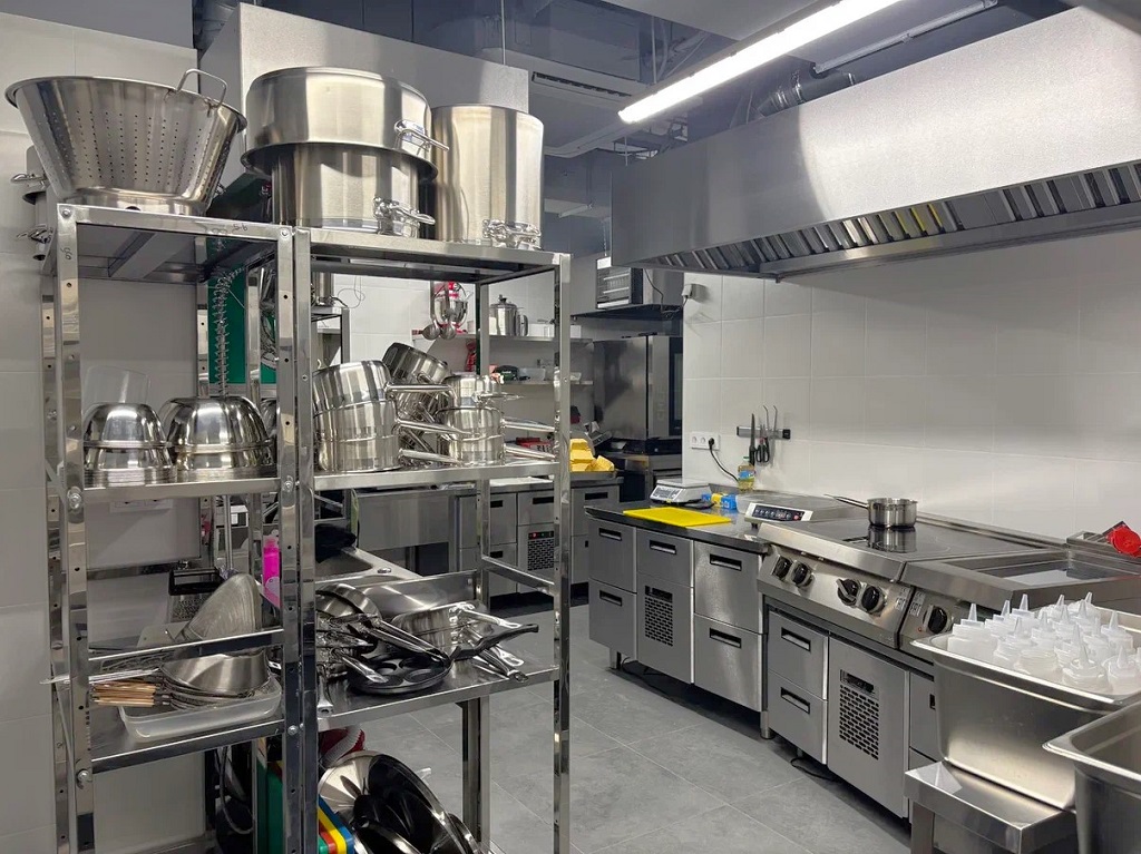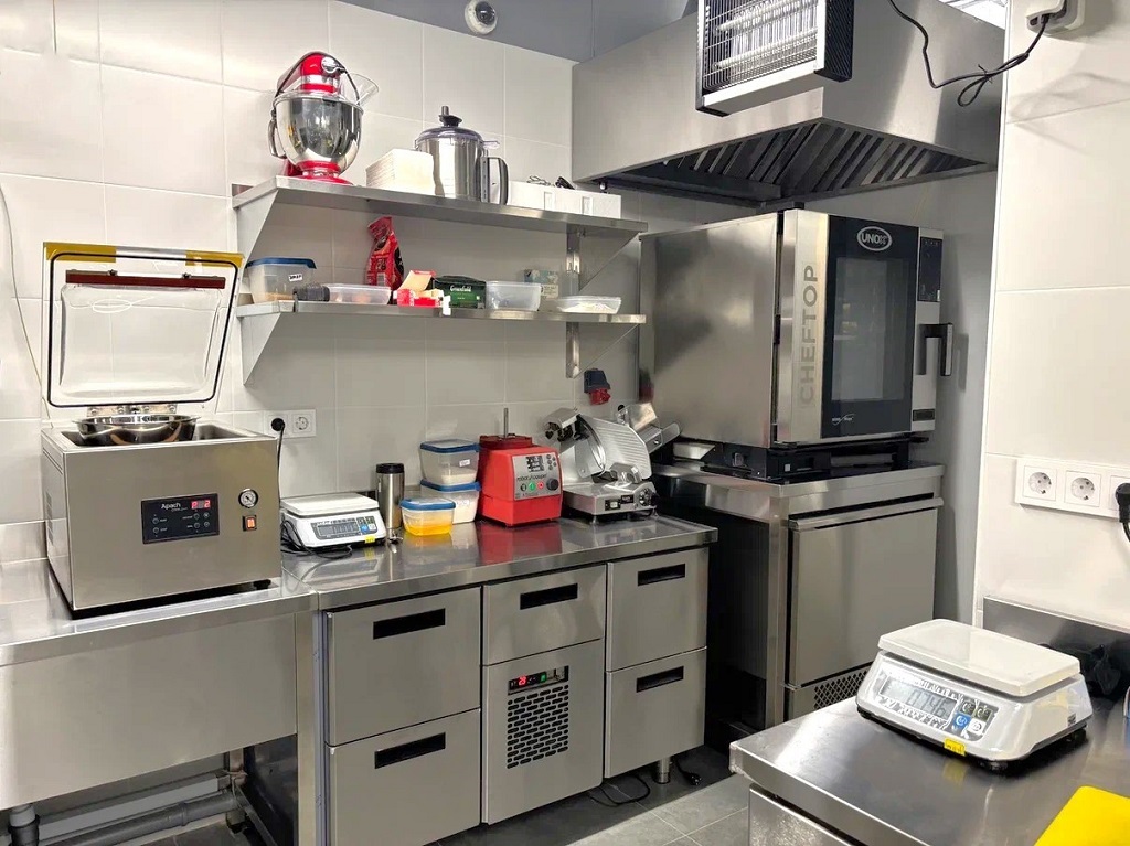 Вся нейтральная мебель на объекте (вытяжные зонты, полки, ванны-мойки), а также холодильные столы, выполняющие роль рабочих поверхностей, — дело рук большой команды специалистов завода БСВ из Петербурга. BSV-inox уже несколько лет является одним из лидеров РФ по изготовлению нейтрального пищевого оборудования из нержавеющей стали. Ребята сильно «прокачались» по качеству исполнения, дизайну, внутренним компонентам. Выдают стильную, эффективную и функциональную продукцию широкого спектра — от столешниц до холодильных витрин. Работают под заказ, по индивидуальным параметрам, поэтому оборудование БСВ с четкостью до миллиметра встает в отведенные и запланированные технологическим проектом места.
