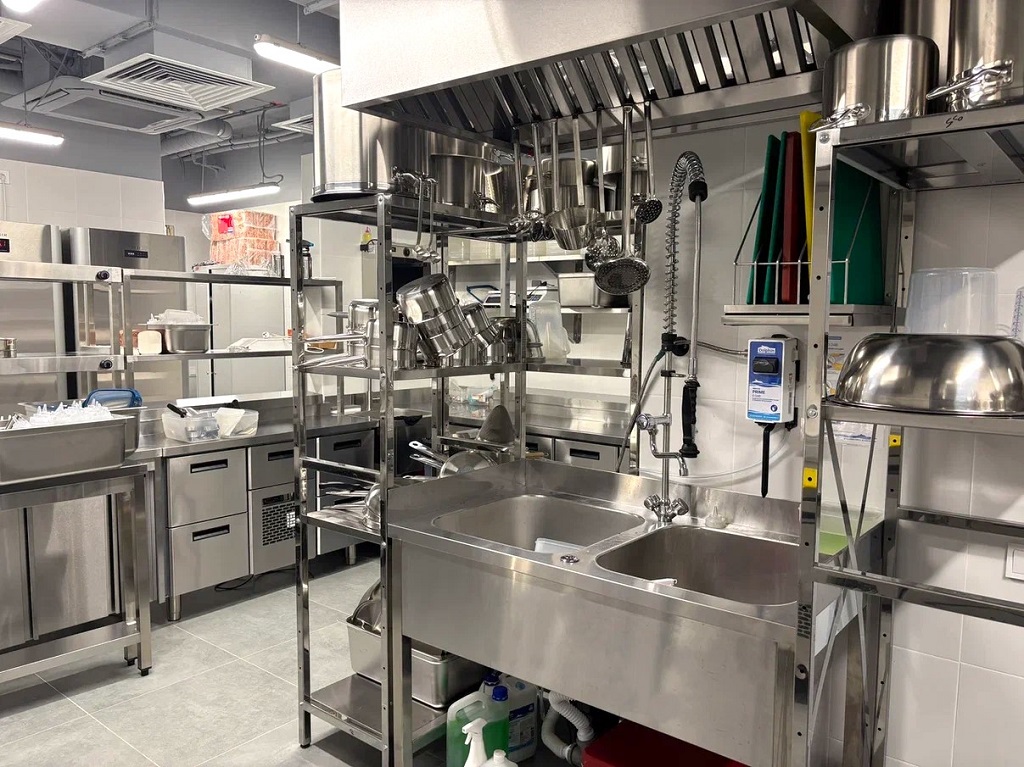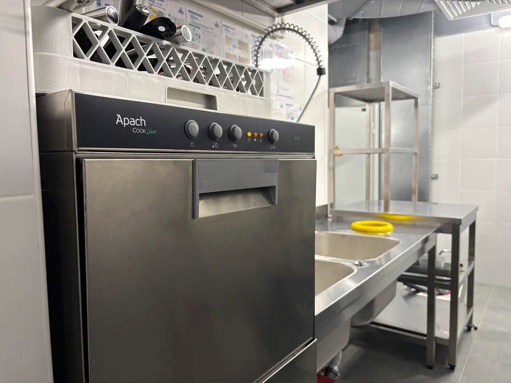 За чистоту кухни, инвентаря, посуды «отвечает» фронтальная посудомойка APACH COOK LINE AF501. Она тихая, экономичная, хорошо обеззараживает тарелки и стаканы. Комплектуется кассетами для мытья разных приборов. Также в помывочной зоне есть моечные ванны с ручным душем и металлические стеллажи для чистой посуды.