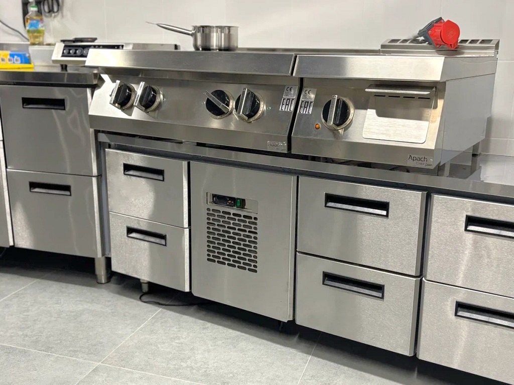 Горячая линия выстроена из оборудования APACH CHEF LINE. Жарочные поверхности и индукционные плиты 700 серии закрывают все потребности поваров по тепловой обработке продуктов.
