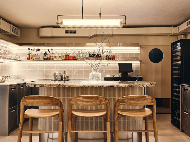 Во втором, камерном зале, появилась барная зона с монолитным столом-островом из мрамора. Выглядит это, как Chef’s Table, то есть гости не отделены барной стойкой от персонала, а наоборот, становятся зрителями и участниками интерактивного процесса приготовления напитков и коктейлей.