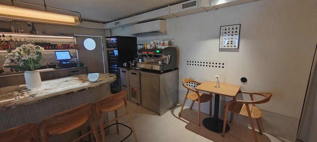 Кухня с открытой зоной выдачи вынесена в зал — гости могут не просто видеть процесс приготовления, но даже стать частью «кулинарной лаборатории вкусов».