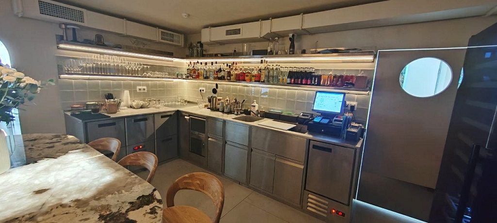 Чтобы качественно укомплектовать открытую кухню и барную зону потребовалось много кастомизированного оборудования из нержавеющей стали. В сотрудничестве производством БСВ были изготовлены столы и модули из нержавеющей стали по индивидуальному проекту.