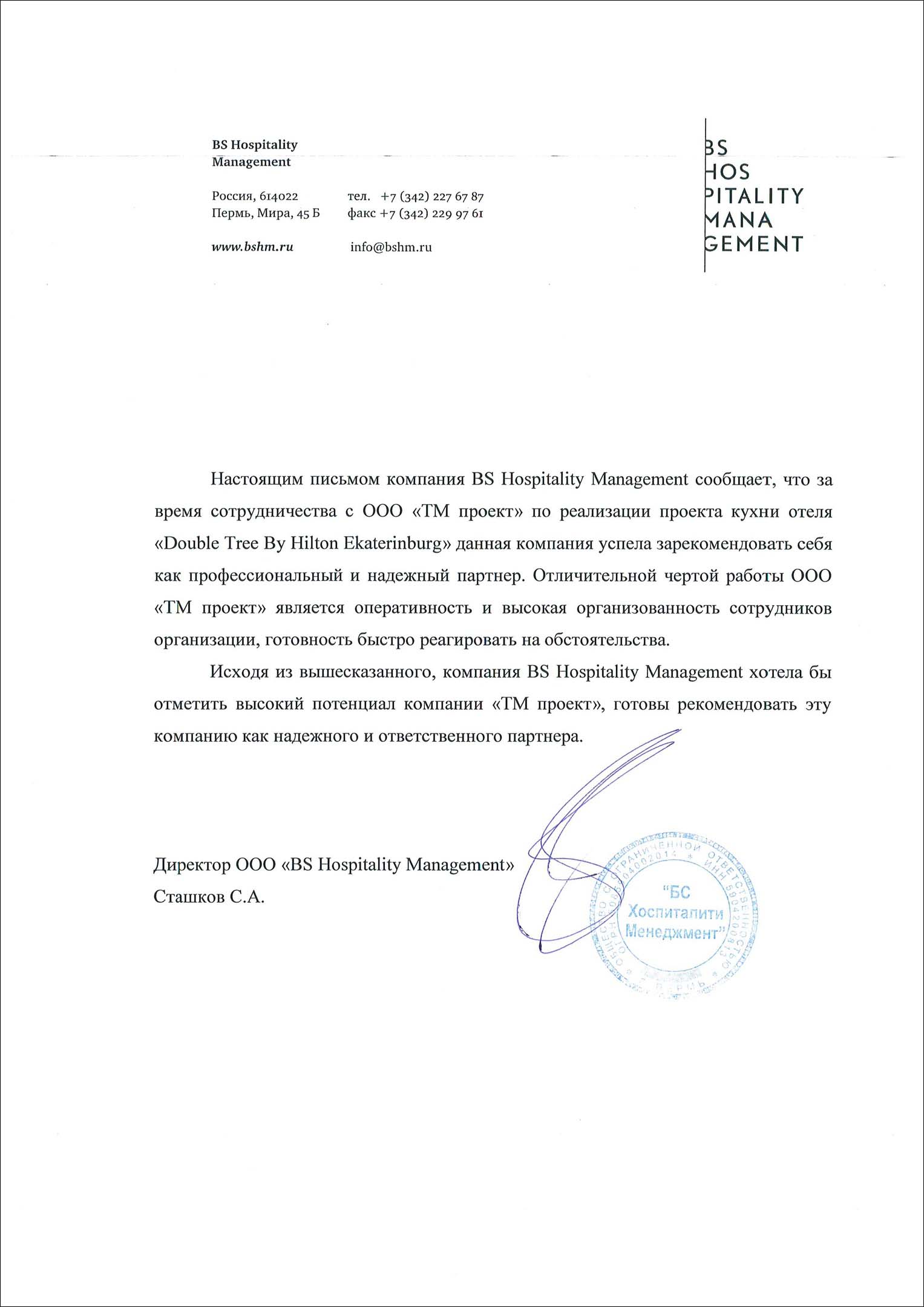 Благодарность от отеля Double Tree by Hilton Ekaterinburg