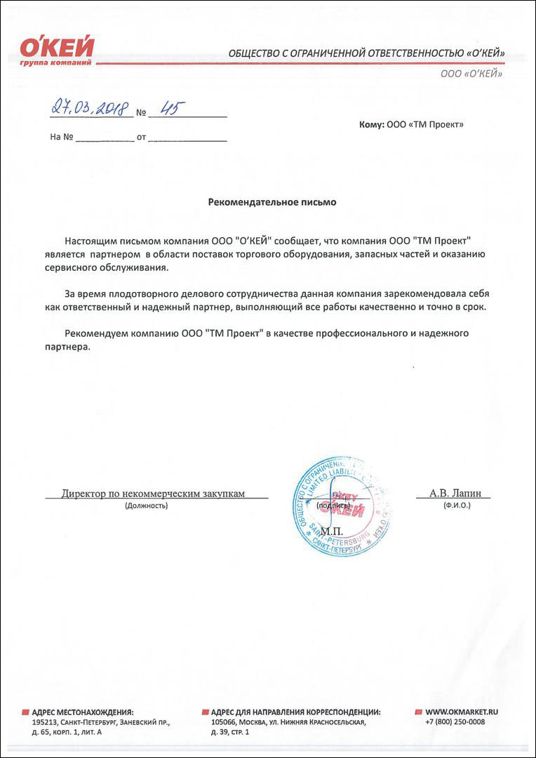 Благодарность от сети супермаркетов Окей