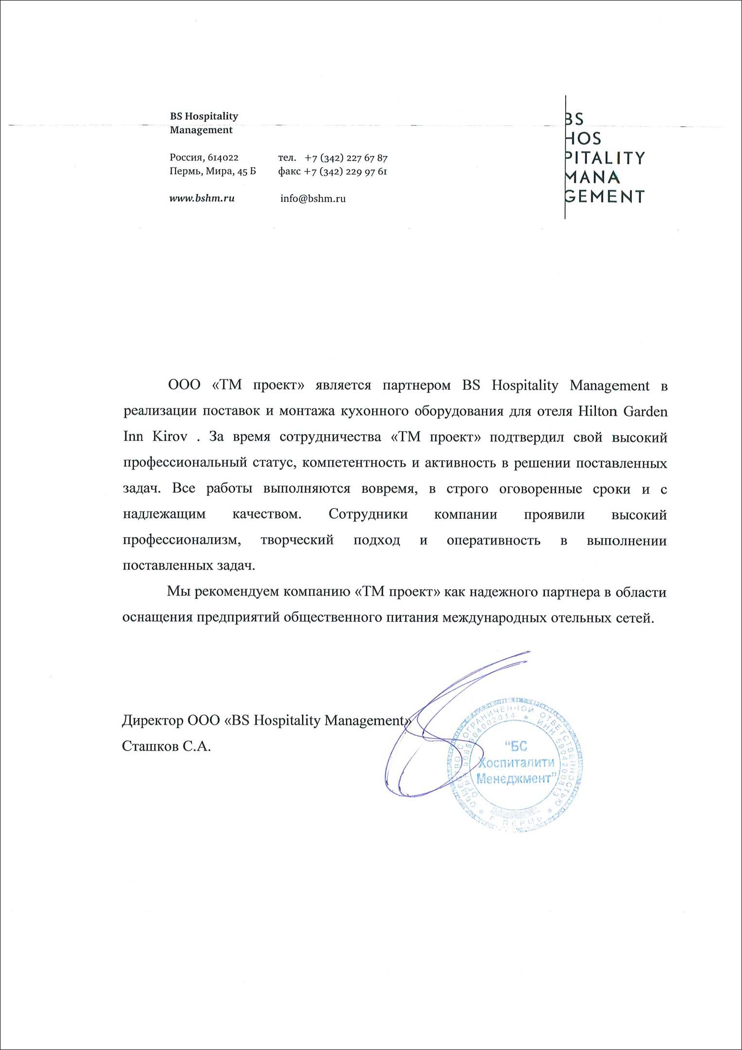 Благодарность от гостиницы Hilton Garden Inn Kirov