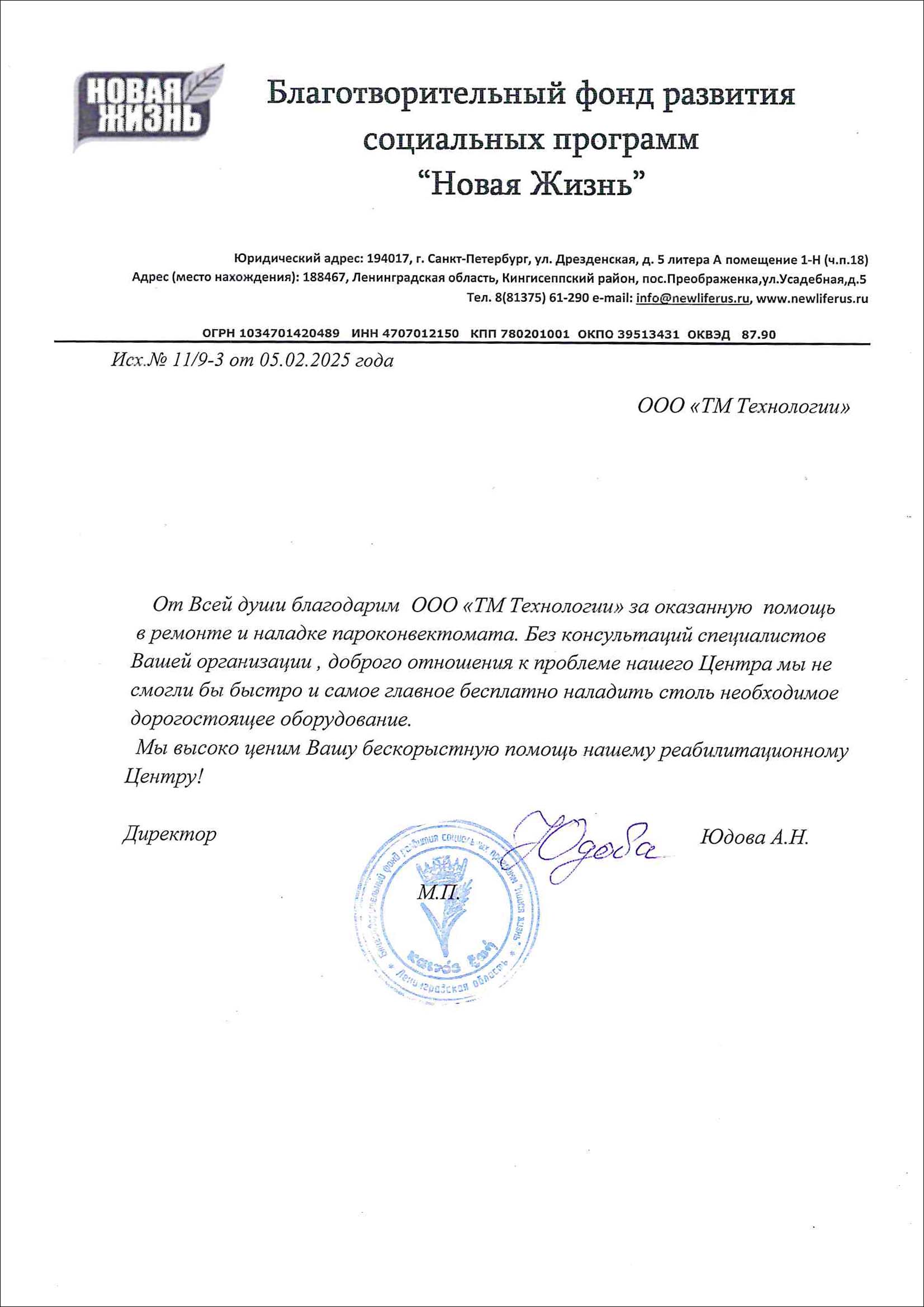 Благодарность от фонда Новая Жизнь